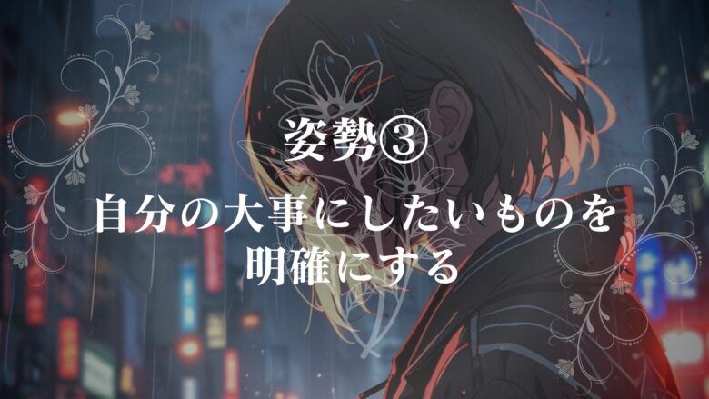 こうした状態に陥らないためには、「あいつはあいつ、自分は自分」といったようなスタンスを確立することが不可欠となります。なお、こうしたスタンスを確立するには、まずは「自分の大事にしたいたいもの」を明確にすることから始めるのがおすすめです。