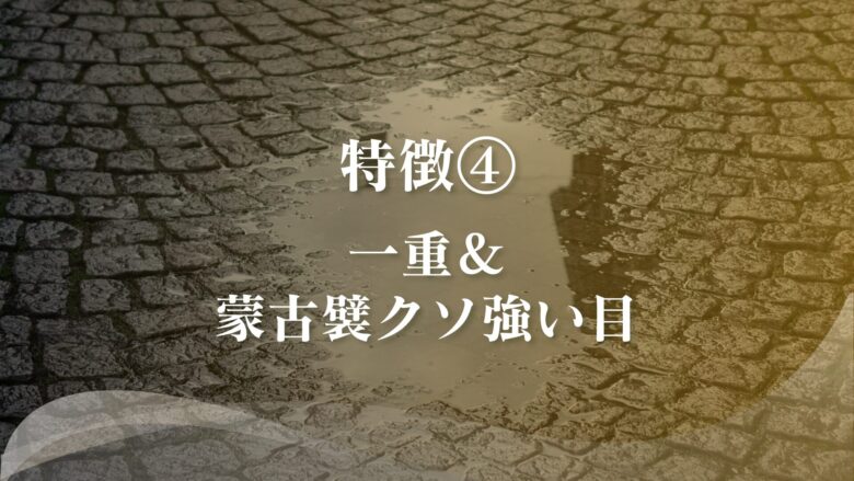 現代日本におけるブサイクモンゴロイドの特徴の4つ目は、「一重&蒙古襞クソ強い目」です。
