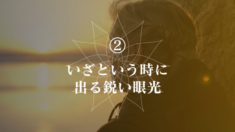 しかし、様々な修羅場を経験している人は、経験をもとにその都度「これをすべき」と決意を固めて、タスクに取り組みます。その際の決意や並々ならぬ集中力といったものが、「鋭い眼光」として表出すると考えられますね。男性なら、これはかなり重要な要素といえるでしょう。