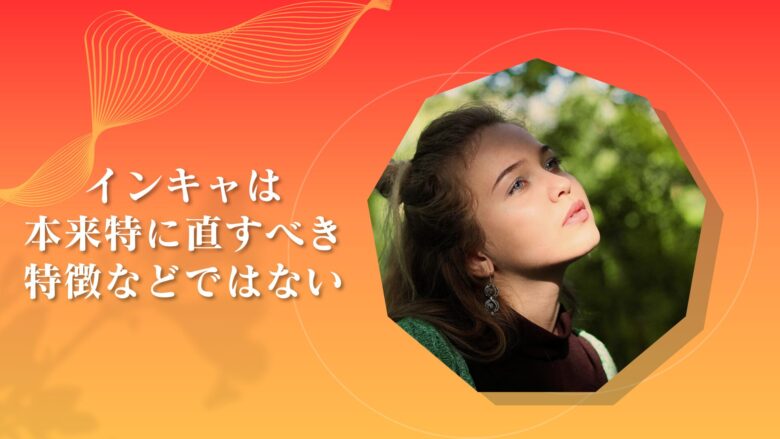 結論から言ってしまうと、インキャは特に直すべき特徴などではありません。月並みな言い方をするなら、インキャは単なる個性の域であって、それをもって何かを言われるような性質のものではありませんね。