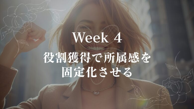 群れる力を身に着ける1か月トレーニングプランの第4週目は、役割獲得による所属感の固定化がテーマです。このフェーズでは、前週まででできた真ら関係をさらに深化させていきます。
