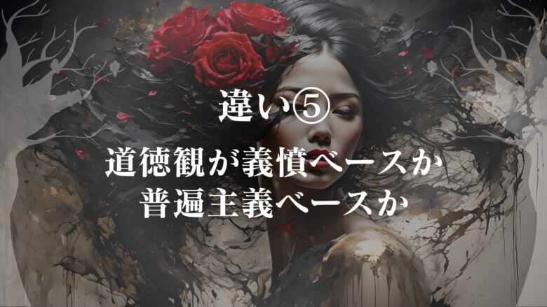 - 違い⑤:道徳観が義憤ベースか普遍主義ベースか
