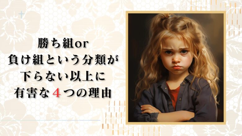 つぎは、勝ち組or負け組という分類が下らない異常に有害な理由について、見たいきたいと思います。勝ち組or負け組という分類が下らない異常に有害な理由は、以下の通り。