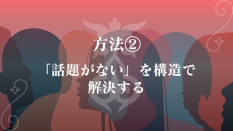 コミュ障でも人見知りでも会話がうまくなる方法の2つ目は、「「話題がない」を構造で解決する」です。