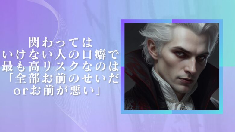 関わってはいけない人の口癖には色々なものがありますが、その中で最も高リスクなのは「全部お前のせいだorお前が悪い」になります。この口癖からは、使用者の強い他責性や強い支配・操作欲といった心理特性がうかがえるため、こうした口癖がある人とはまともに関係を築くのは困難です。