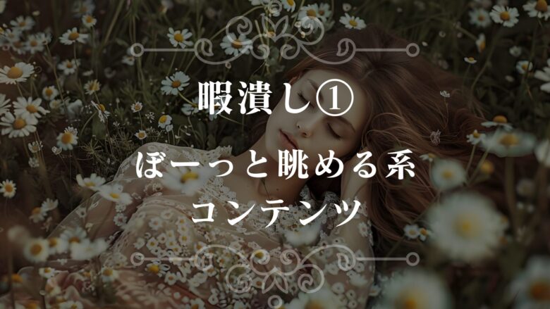 先ほども触れたように、暇だけど何もしたくないという時は、基本的にぼーっとするのが一番。そこで、暇だけど何もしたくない時は、ぼーっと眺めるだけで楽しめたり心の癒しになるコンテンツにふれるといいひまつぶしになります。